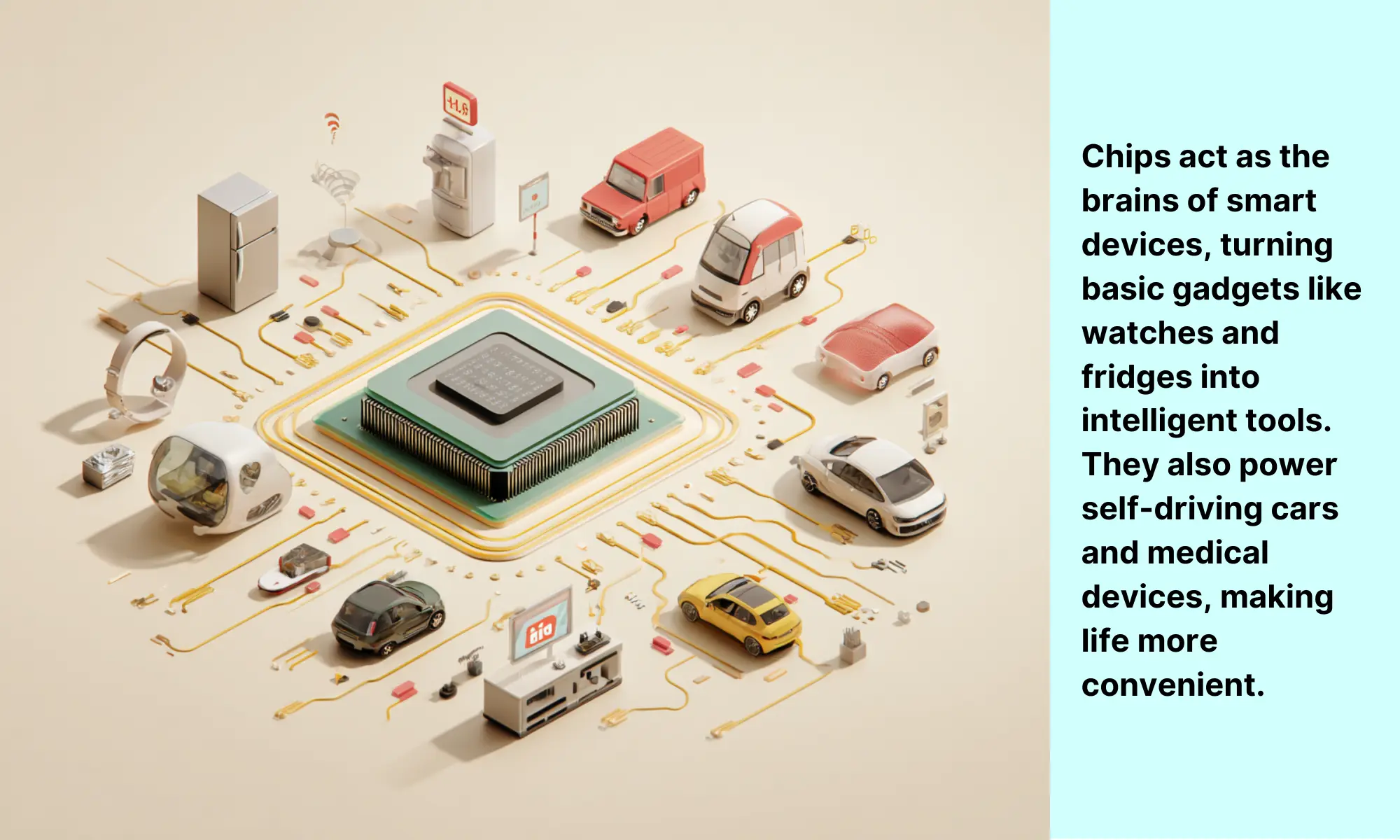 Chips also power advanced technology like self-driving cars, which use AI chips to understand traffic and drive safely. In medical devices, chips help doctors by analyzing health data in real-time. They are truly the brains behind modern technology, making everyday life smarter and more efficient.